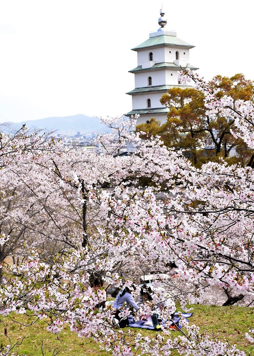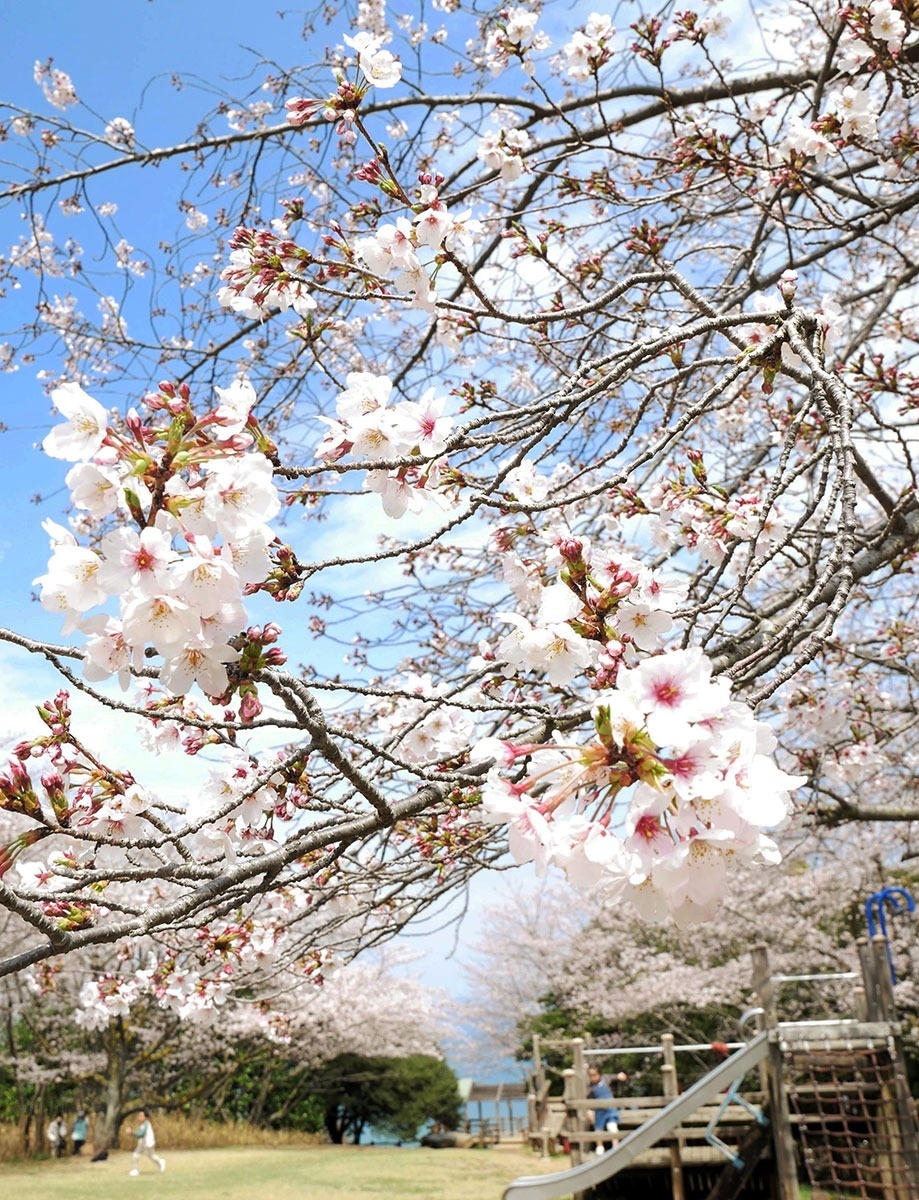 青ノ山は標高224メートル。山頂には広場があり、展望台から宇多津町の町並みや瀬戸大橋、瀬戸内の島々が見渡せる。広場はソメイヨシノに囲まれ、大型遊具を楽しむ家族連れの歓声が響く。遊歩道も整備されており、花見弁当やハイキングなどさまざまに楽しめる。(2日撮影)