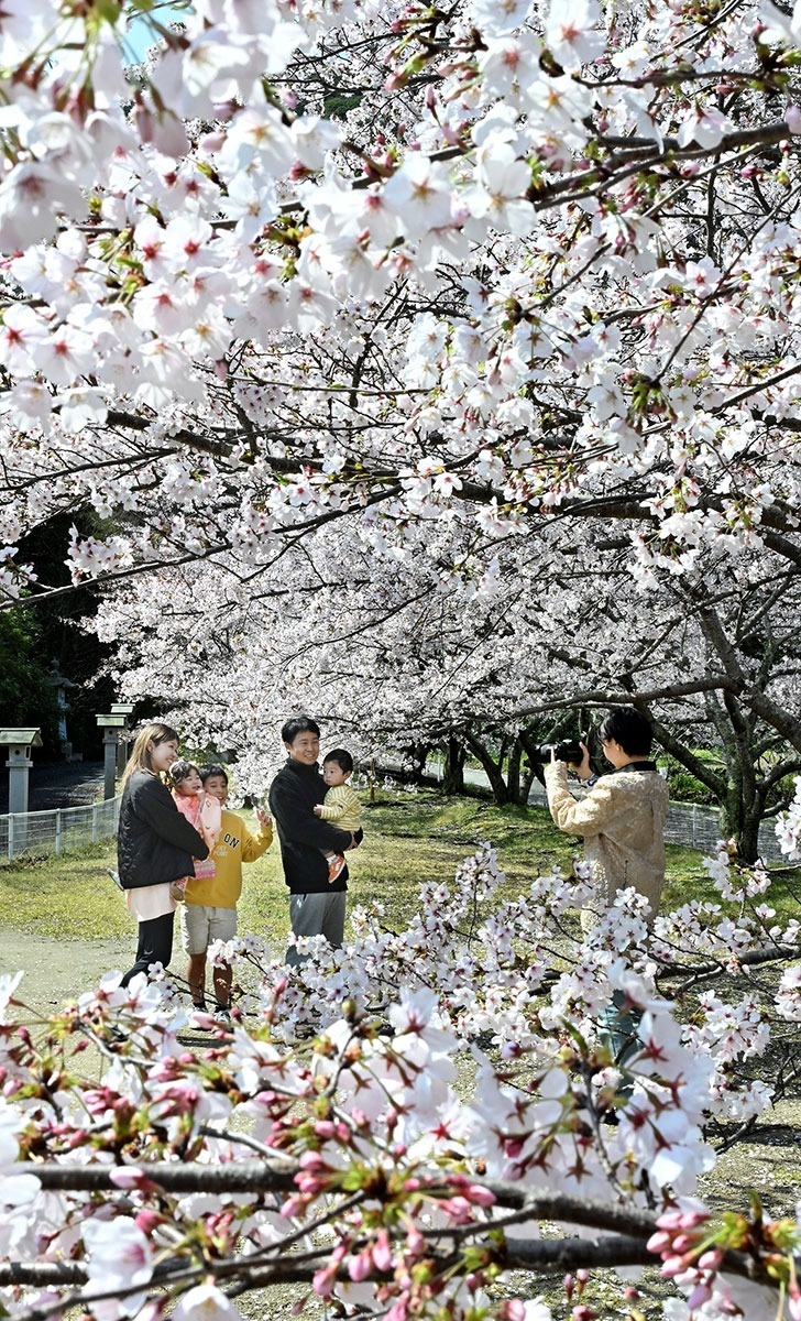 宇佐神社と園内の宮池に浮かぶ亀島を結ぶ約300メートルの桜並木は圧巻。見頃が終わるまで夜間ライトアップ(午後6~同9時)も楽しめる。5日には同神社恒例の「鎮花祭(はなしずめのまつり)」があり、平安絵巻から飛び出したような行列が桜のアーチの下を練り歩く。(2日撮影)