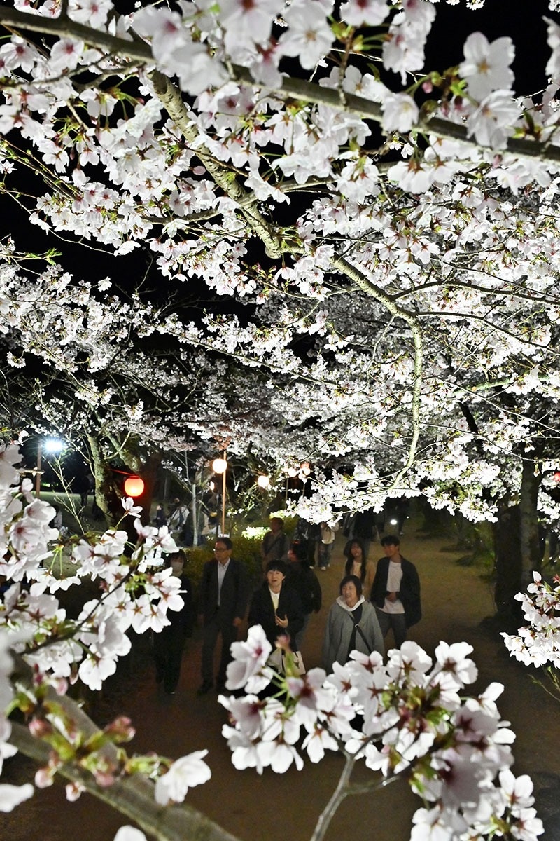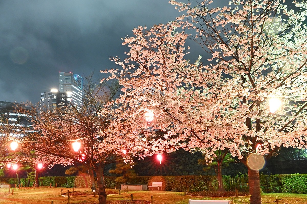 ソメイヨシノなど約300本が咲き誇る。恒例のライトアップは5日まで行われ、情緒あふれる夜の庭園美を満喫できる。頭上を覆うように夜桜のトンネルが広がる北門近くの芝生広場では、来園者が昼とは違った特別な雰囲気を堪能している。(2日撮影)