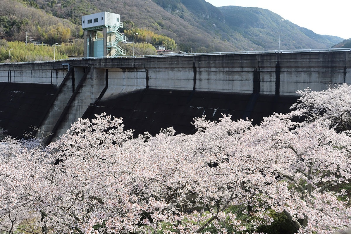 伝法川上流にある殿川ダム周辺の約1万3500平方メートルの公園に、ソメイヨシノなど約110本が植樹されている。標高約140メートルの高台ながら日当たりが良く、島内の他地域より満開が早い。山の緑に野鳥のさえずりが響き、ピンク色の花が押し合うように咲く様子は圧巻だ。(2日撮影)