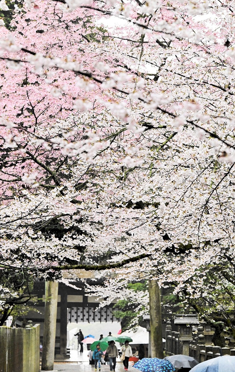 境内のソメイヨシノやヤマザクラなど約3500本が見頃を迎えている。大門から約150メートルにわたって石畳が続く「桜馬場」では、かれんな花のアーチが参拝者をお出迎え。今年は外国人客の姿も多く見られ、写真を撮るなどして楽しんでいる。(1日撮影)
