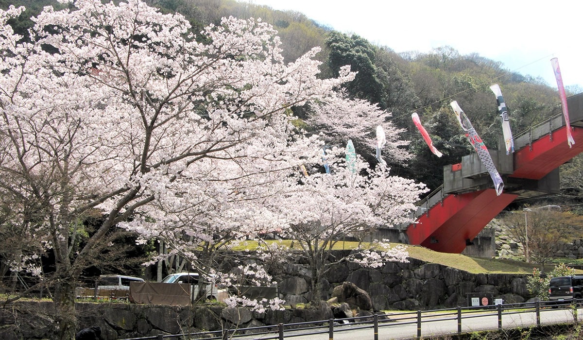 門入ダム周辺にはソメイヨシノなど約千本の桜が点在している。カメリア温泉近くの真っ赤な「門入ブリッジ」には、色とりどりのこいのぼりが2日に設置されたばかり。家族連れらが満開の桜と一足早いこいのぼりとの競演を楽しんでいる。(2日撮影)