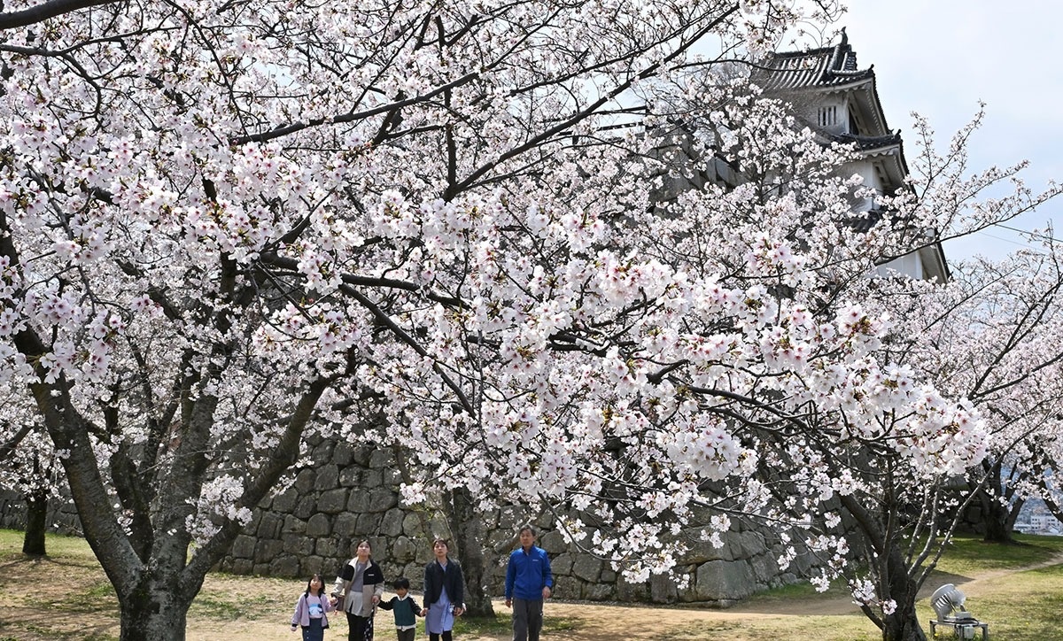 「石垣の名城」として知られる城内では、ソメイヨシノを中心に約650本の桜が見頃を迎えている。大手門付近のうるし林や二の丸周辺が見どころだ。12日まで開催の「桜まつり」期間中、夜間は約500個のぼんぼりがともされ夜桜も楽しめる。(2日撮影)