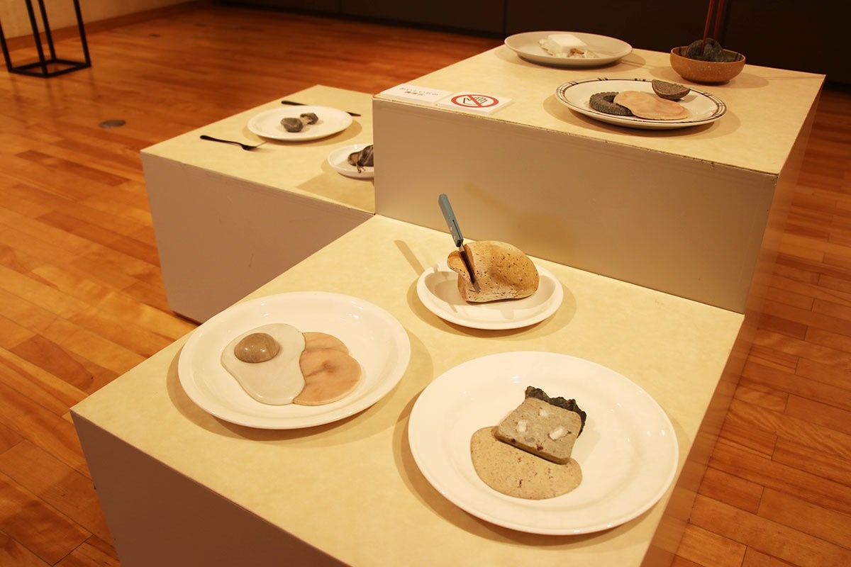 四国で初となる今回の展覧会には、1990年から今年までに制作した25点を出品。目玉焼きやハム、パン、アイスクリームなど、石を食べ物に見立てた作品は、表面を滑らかに仕上げ、食べ物の質感をリアルに表現している。テディベアや、雪が積もった地面を踏みしめる長靴などを表したユニークな作品もあり、来場者の興味を誘っている。