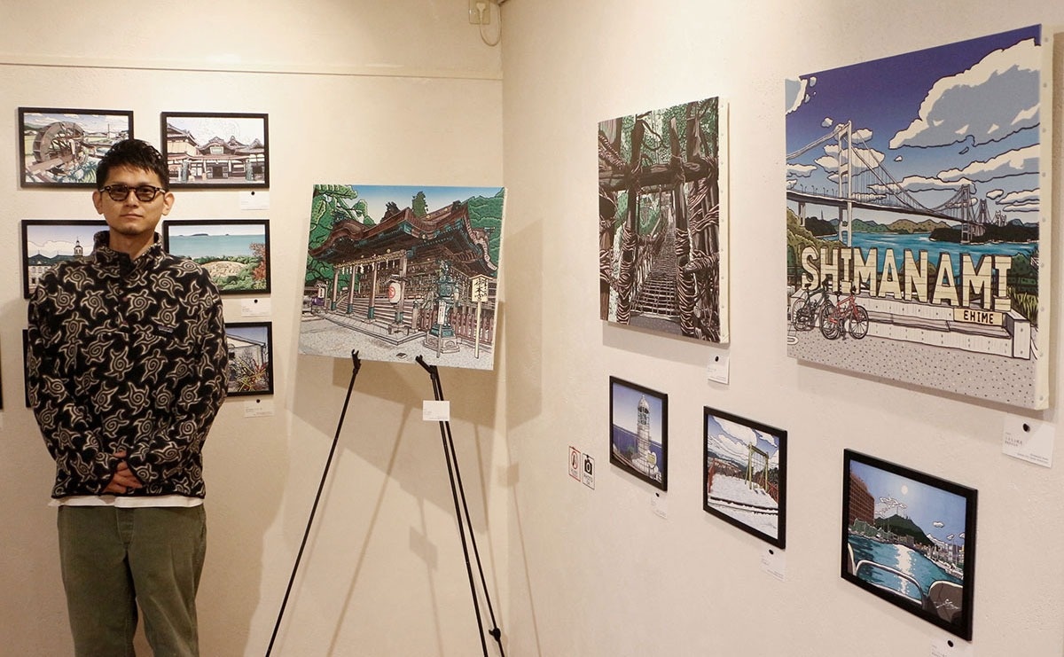 一帯で開催中のアートフェスティバル「琴平山博覧会」の一環。描いたのは、インスタグラムなどで作品を発表している“四国観光地画家”のMORIOこと森本悠介さん(37)=高松市=。仕事で観光地を巡るうち四国の魅力に改めて気付き、得意の絵を生かしてより多くの人に魅力を知ってもらおうと、昨年から制作を始めた。今回が初の個展。