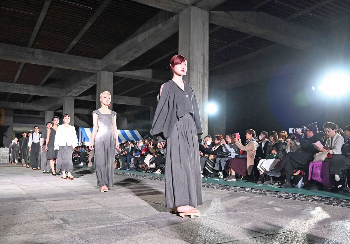 日が暮れた後のピロティで行われたショーでは、白色やグレーといった落ち着いた色の保多織生地で作ったワンピースやジャケットをまとったモデルたちが、ゆったりとしたウオーキングで衣装をアピール。ショーに併せて、池田豊人県知事と吉原さんによるトークや、衣装に使われたボタンなどの小物を手掛け、パリにも同行した県内の職人らによる報告会も行われた。