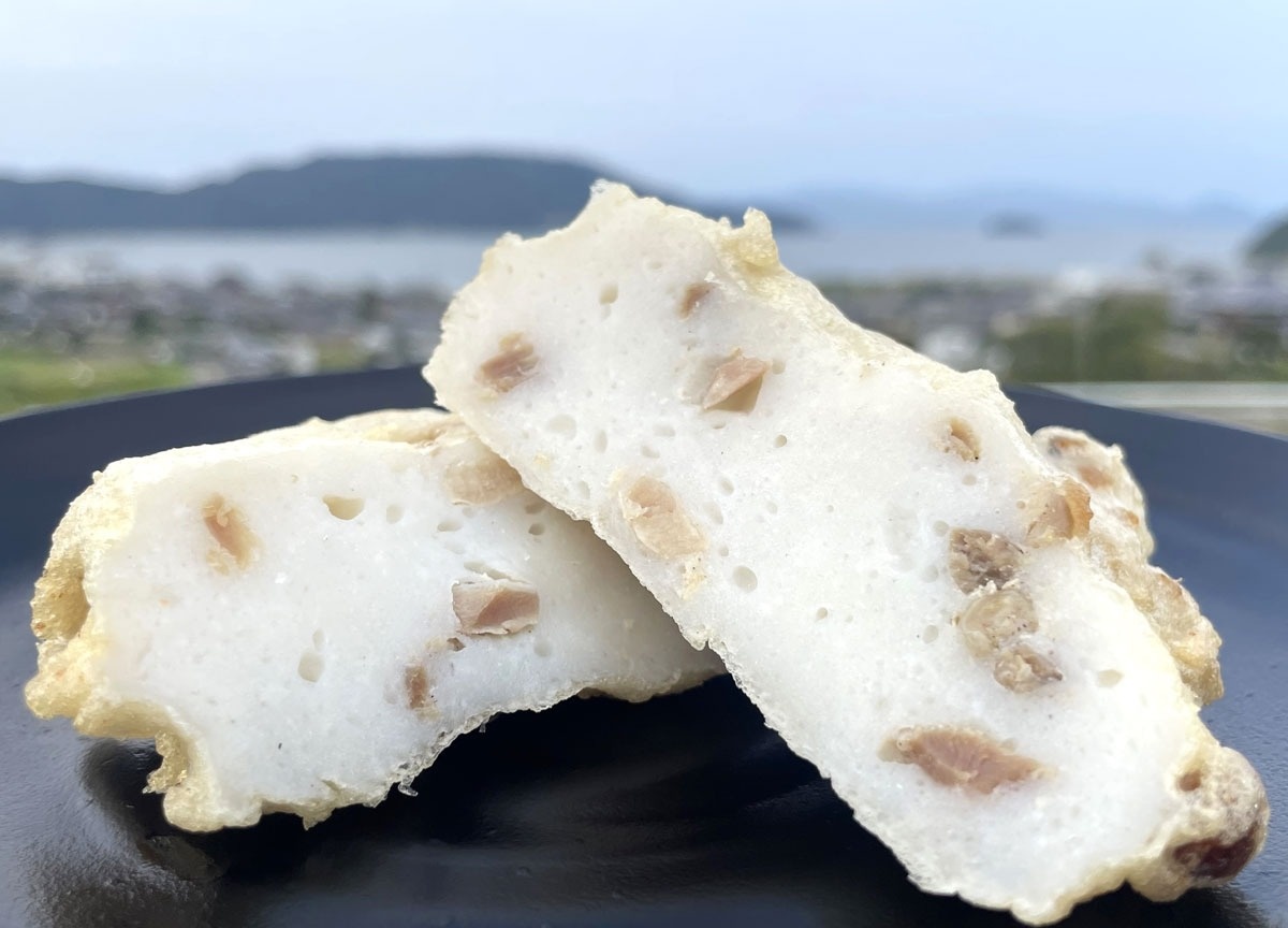 さぬき市津田町の老舗「朝見商店」の天ぷら用すり身をベースに、スパイシーな親鳥肉をまぜて香ばしく揚げた。親鳥の濃厚なうまみと白身魚の優しい風味を両立させ、おやつやおつまみとして手軽に食べられる。