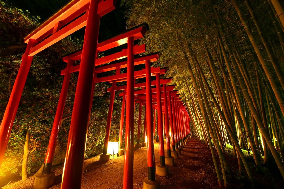 昼間とは異なる庭園の魅力を多くの人に知ってもらおうと企画。鳥居のライトアップは初めてという。