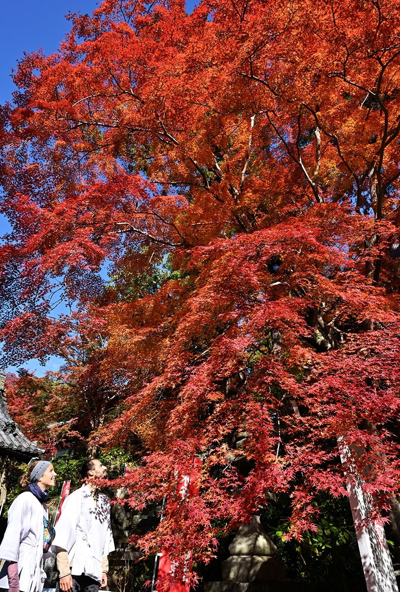 2025年11月20日(木) ニュース NEW さぬき錦景=白峯寺(香川県坂出市青海町) 五色台の西端、白峰の中腹に位置する四国霊場81番札所。境内の紅葉は今が真っ盛り。歴史的な建造物との相性も良く、どこを切り取っても絵になる。特に阿弥陀堂や手水(ちょうず)場周辺のモミジは深い赤に染まっており、参拝客や観光客らの多くが足を止めている。(19日撮影) (四国新聞・2025/11/20掲載)