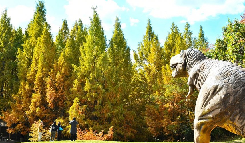 2025年11月20日(木) ニュース NEW さぬき錦景=太古の森(香川県木田郡三木町) 新さぬき百景の一つ「山大寺池」のほとりに位置する憩いのスポット。天高く伸びるメタセコイアは日増しに色づき、晩秋の陽光を受けて鮮やかに輝く。ゆっくりと散策したり、恐竜のオブジェで遊んだりする人々の姿が見られ、秋の一日を満喫できる。(19日撮影) (四国新聞・2025/11/20掲載)