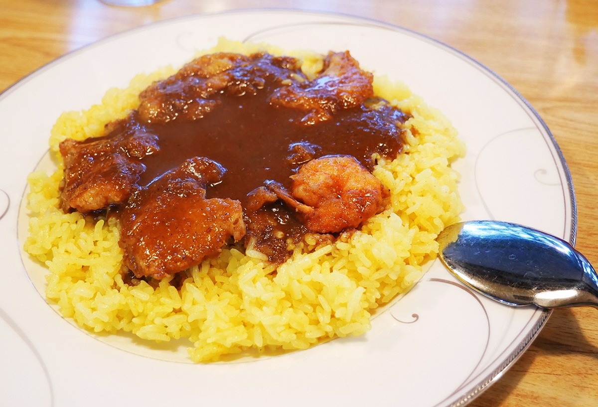 テーブルに待望の一皿。鮮やかな黄色いターメリックライスに温かなルーをゆっくり注ぐ。立ち上る湯気すら、芳醇(ほうじゅん)。一口。23種類のスパイスが複雑に絡み、奥深い香りが押し寄せる。一口。1日煮込んだタマネギの甘み、鶏がらスープのうまみがにじむ。辛さを抑え、風味が際立つ甘口ルー(680円)も追加し、一口、一口…。減っていくルーとライスが悲しい。