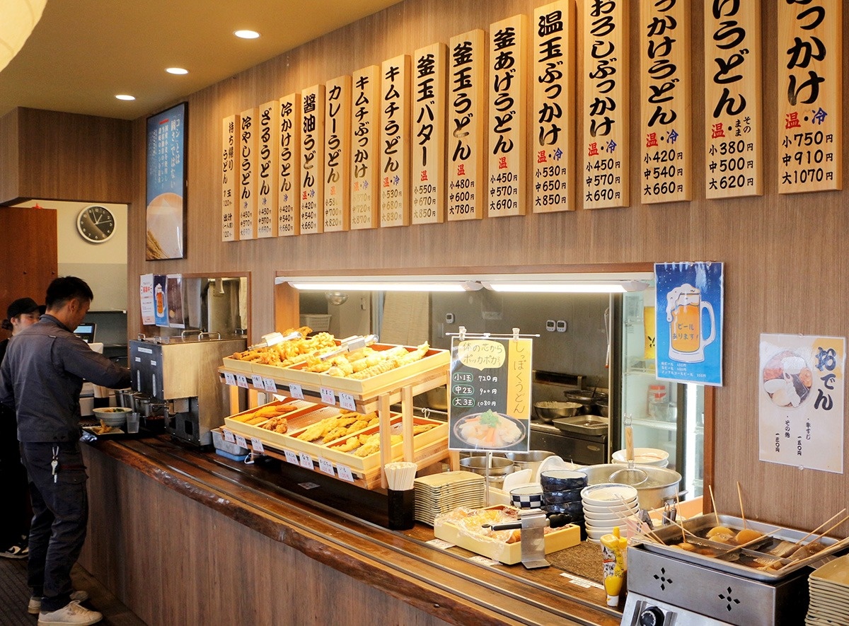 つるつるの細麺、店いわく「ぐにゅこつ」食感のうどんが特徴のセルフ店。麺は国産小麦、だしは伊吹いりこをふんだんに使用し、昔ながらの讃岐の味にこだわっている。一押しはかけうどん(380円)だが、ボリュームのある肉ぶっかけ(750円)、具だくさんのしっぽくうどん(720円)もおすすめ。夜営業も行っている。