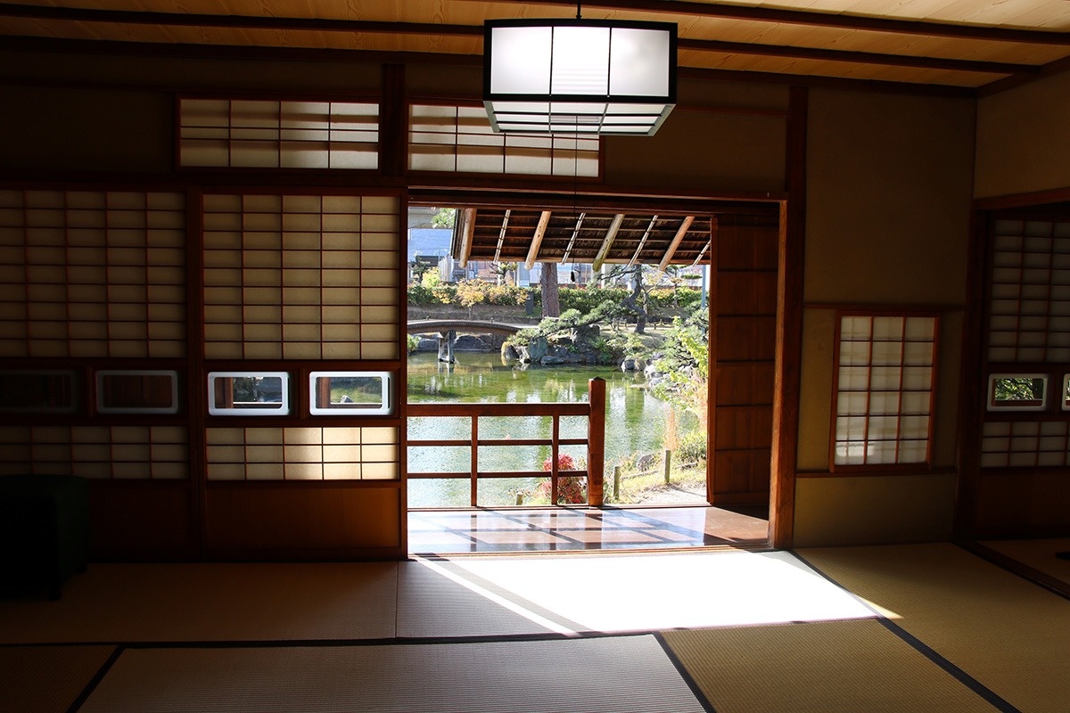 今回は特別に中を見せてもらった。いずれも茶室を備え、窓からは庭の景色と赤色に色付いた山々を望むことができた。住宅や高架も視界に入るものの、築庭当初から100年以上がたった今もなお、借景を取り入れたことがうかがえるほど見応えがあった。