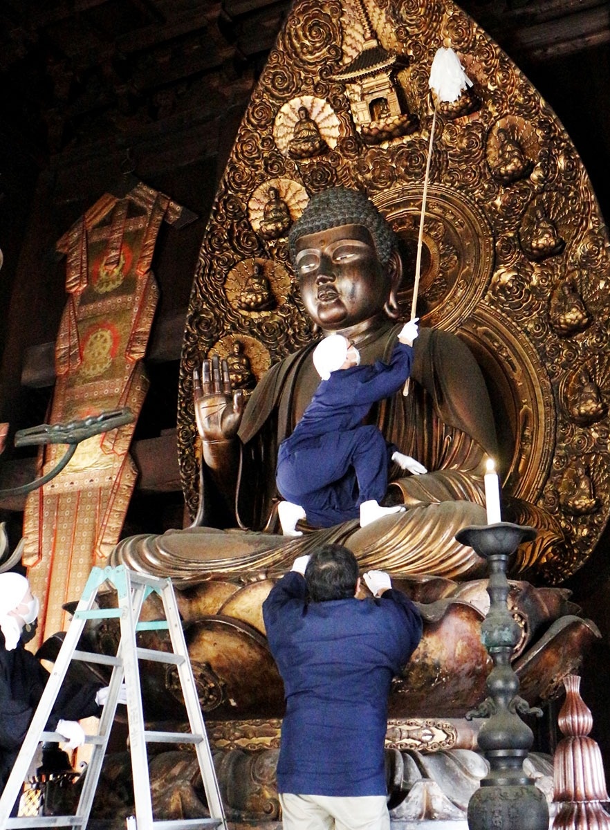作業には僧侶や職員約20人が参加。本尊の左手と、手で持っている薬壺(やっこ)を取り外した後、膝の上に乗り、和紙を付けた特製のはたきで優しくなでるようにほこりを払った。本尊の顔や法衣のひだ、右手の指などは、はけで隅々まできれいにした。また金堂だけでなく、南大門や五重塔も竹ぼうきで汚れを落とした。