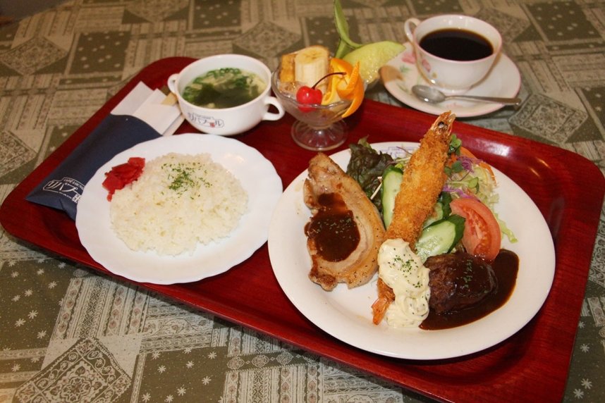 まずは約20センチのジャンボエビフライ。このぷりぷり感がたまらないんだな。脇を固めるのはハンバーグにポークソテー。洋食の王道がそろい踏みだ。ソースは赤ワインも入った特製デミグラス。肉は歯応えがしっかりと。かむほどに深みのある味が口中に広がる。