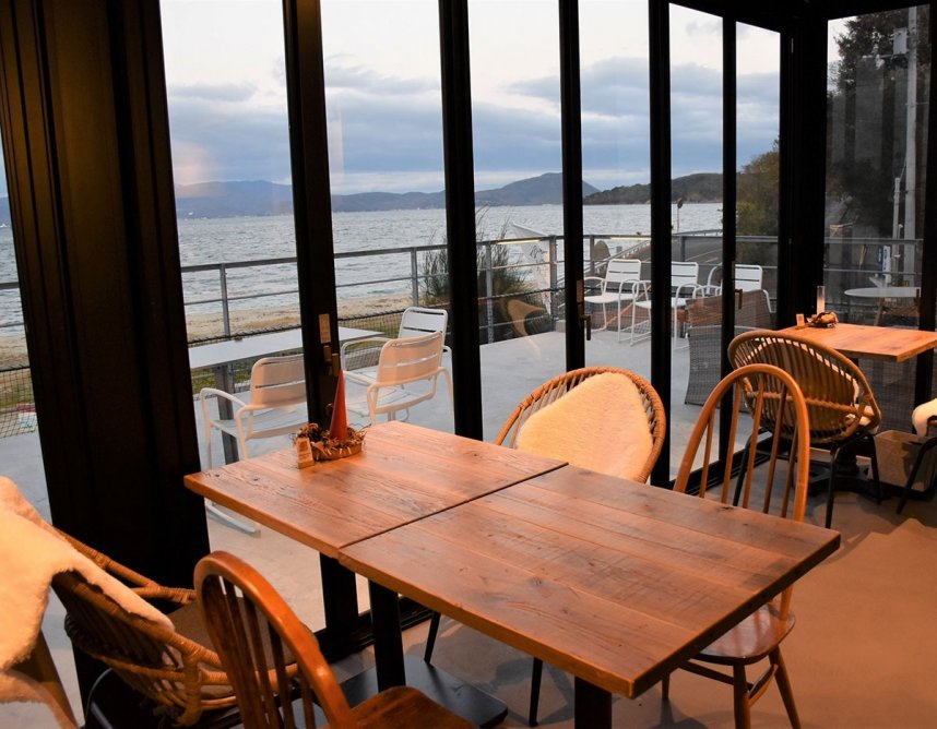 愛犬と店内で食事を楽しめるカフェレストラン。瀬戸内海を一望しながら、ゆったりとした時間を過ごせる。ランチは、地元で取れた魚介類を使った「海の幸のペスカトーレ」などの週替わりの生パスタ(サラダ、スープ付きで1900円)が人気。2月末まで「冬カフェ」を開き、特別メニューを提供する。有料のドッグランも併設している。