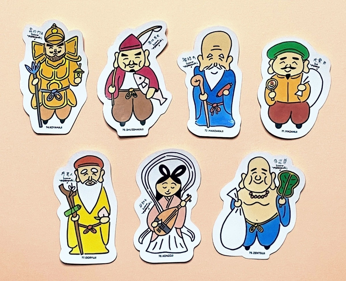 四国霊場71番札所・弥谷寺(香川県三豊市)から77番札所・道隆寺(多度津町)までの7カ寺が、各寺ゆかりの七福神をデザインした「七福神お守りステッカー」を作製した。坂出市在住の画家山口一郎さんがデザインした優しい絵柄で、ステッカー集めをしながら七ケ所まいりを楽しんでもらう。