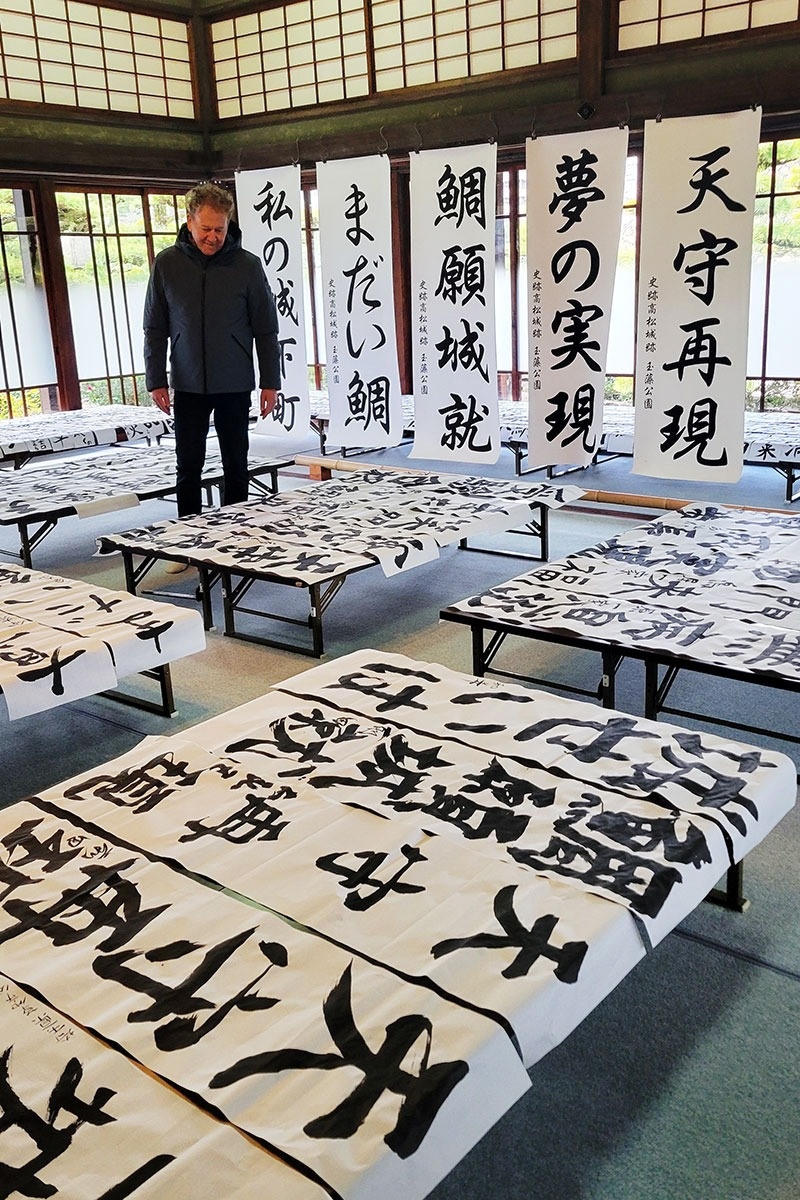 会場の披雲閣「蘇鉄(そてつ)の間」には、「うま年」など今年の干支(えと)にちなんだ言葉のほか、「初志貫徹」「笑門来福」「温故知新」などの四字熟語を伸びやかに書き上げた力作がずらり。「香川マラソン完走」「受験合格」など自分の目標や願い事を記した作品も並んでおり、来場者は一つ一つじっくりと見入り、個性あふれる文字や言葉に目を細めていた。