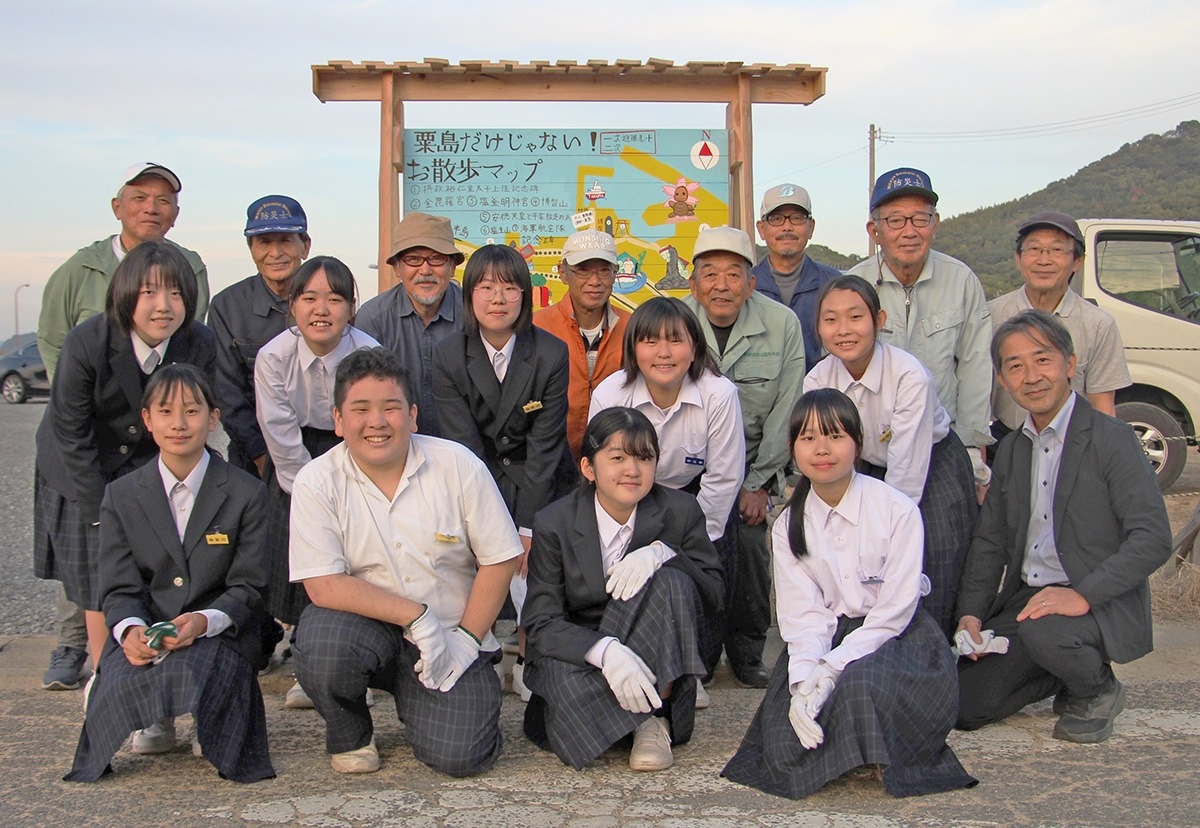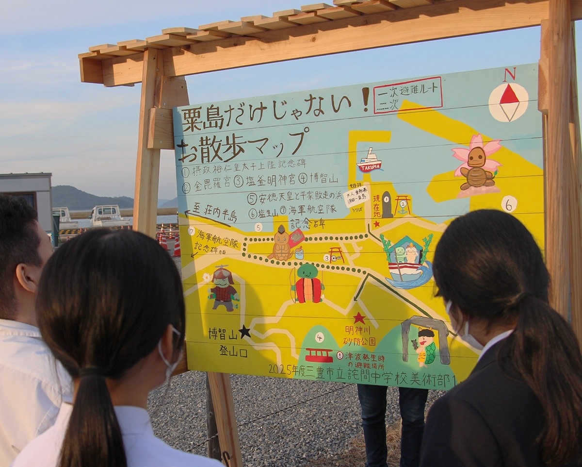 香川県三豊市の粟島への定期船が発着する須田港(同市詫間町)周辺の史跡などのお薦めスポットを案内する絵地図の看板がお目見えした。地元の自治会が企画し、詫間中学校の美術部員が手がけた。生徒たちが考案したタイトルは「粟島だけじゃない! お散歩マップ」。同校のキャラクターをあしらって親しみやすいデザインにし、観光案内に加えて災害時の避難ルートも書き込んだ。