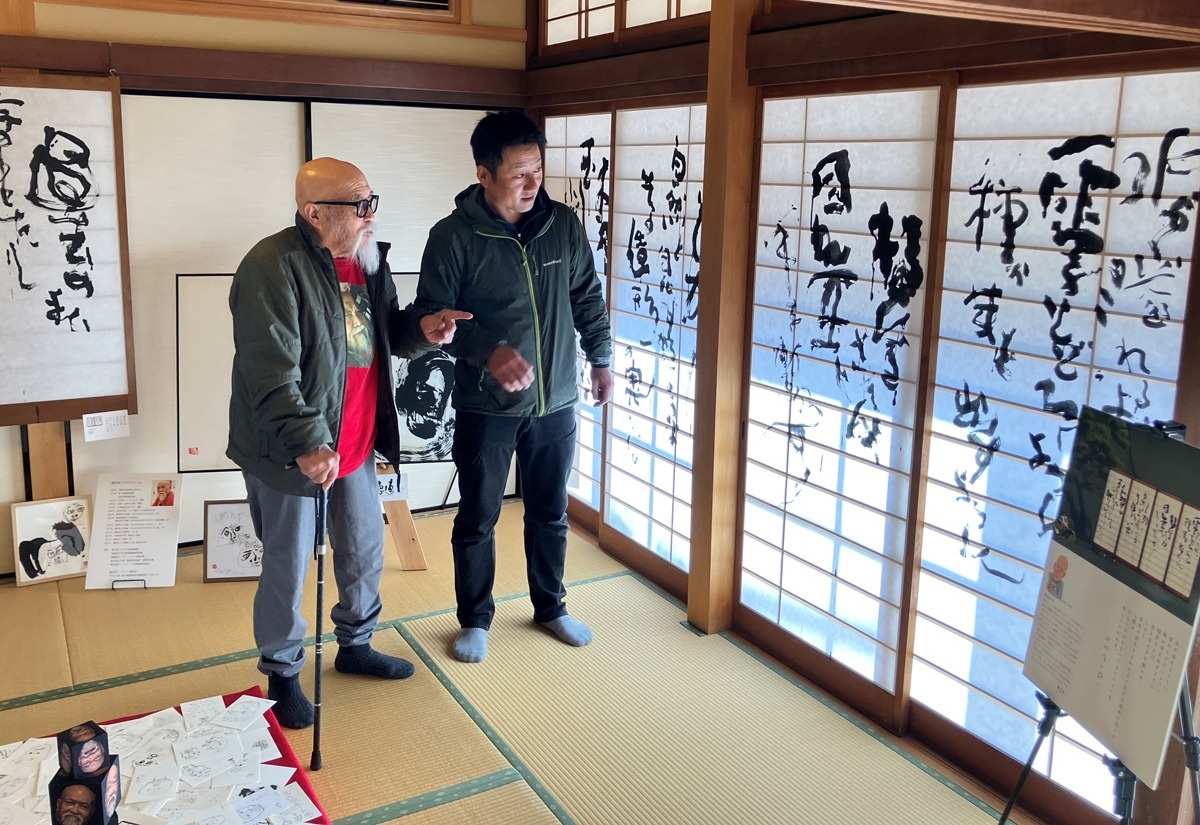 和室の障子4枚を使った作品は、自宅の障子を移設してきたもの。詩人の故谷川俊太郎さん(2024年死去)が樋笠さんの作品集に寄せた「詩」を、追悼の思いを込めて作品にした。制作に際しては、樋笠さんの手が届く範囲に、3人がかりで障子を動かしてもらいながら仕上げた。