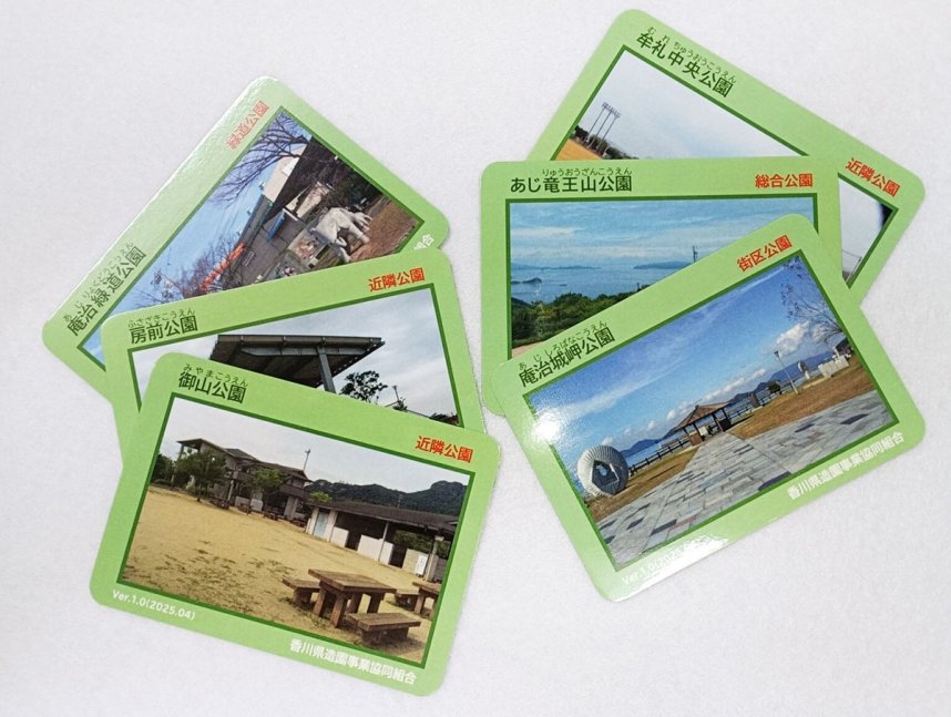 製作したのは、同組合が市から委託を受けて管理運営している御山公園、牟礼中央公園、房前公園(以上牟礼町)、庵治城岬公園、庵治緑道公園、あじ竜王山公園(以上庵治町)の計6カ所のカード。紙製で、サイズは縦6・3センチ、横8・8センチ。設置年月や面積などの公園のデータや特徴、お薦めポイントなどを記載している。