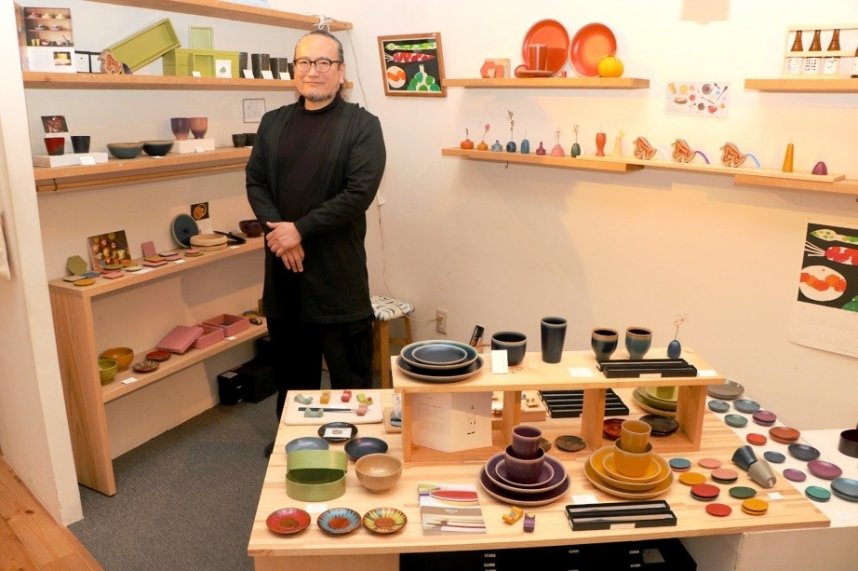 香川県内の漆芸家でつくる「さぬきうるし Sinra(森羅)」の作品展「日々の漆器展」が、高松市北浜町のkitahama blue storiesで開かれている。日常の食卓に映えるカラフルな器が会場を彩っている。26日まで。