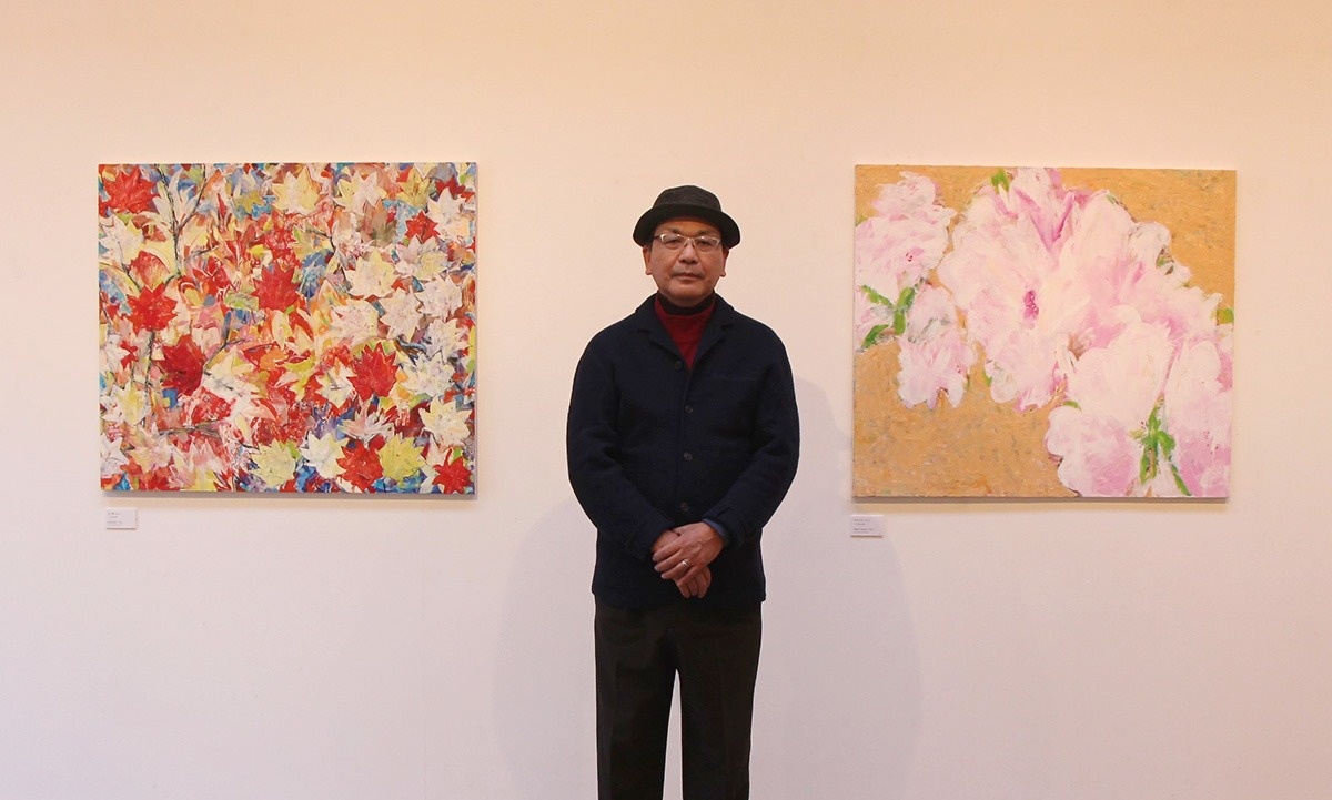 油彩画のうち「幸せな花」と題した作品は2点出品した。白を基調にした花びらに薄い桃色を溶け込ませた温かみある作品。松村は自分の思いのままに筆を走らせたと言い、作品のどこかに描かれたアリなどの生き物を探しながら鑑賞できる工夫も凝らした。