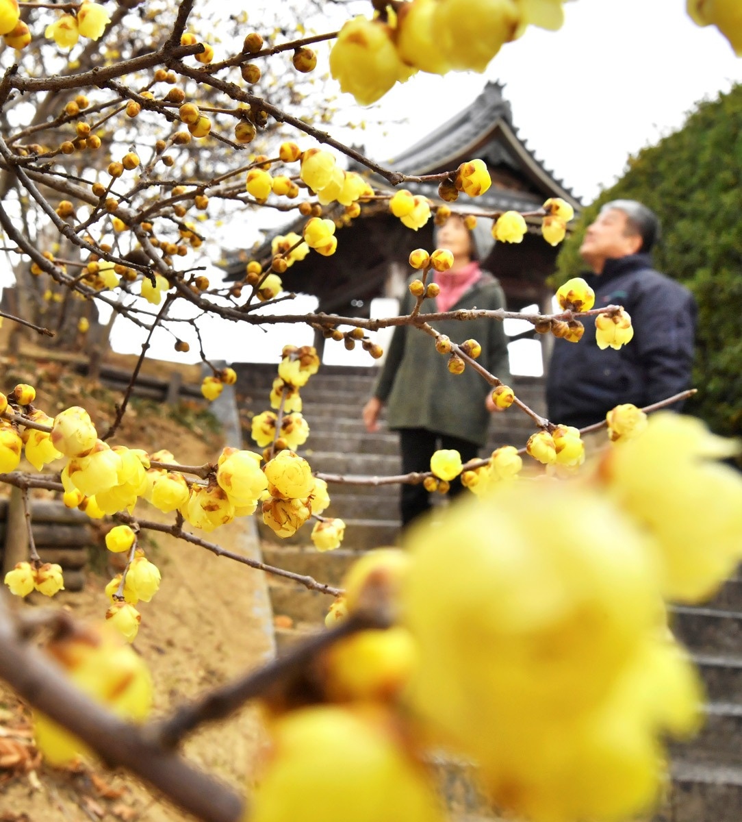 直径2センチほどの丸いロウバイの花は半透明で、ろう細工のように光沢がある。西讃の名所として知られる延命院では、参道の石段沿いと前庭、裏庭の3カ所に計約120本が植えられている。今年の開花状況は例年並みで、29日現在、六分咲き程度になった。2月上旬に一番の見頃を迎えそう。