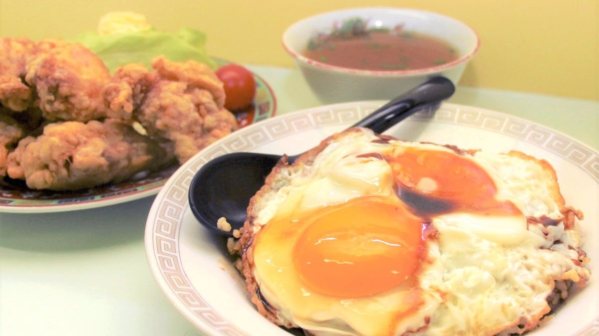 こっちも笑顔になったところで焼豚玉飯登場。器の大半を二つの目玉焼きが占領。半熟だ。スプーンでその一角を崩す。とろっとした黄身がその下に隠れていたご飯と焼き豚にかかる。はい、食べ時。32年間継ぎ足しの甘辛いしょうゆだれ、黄身の甘み、具材が口の中でハーモニーを奏でる。何とも癖になる味。ジューシーな唐揚げとともに一気に完食。目的達成。大満足。