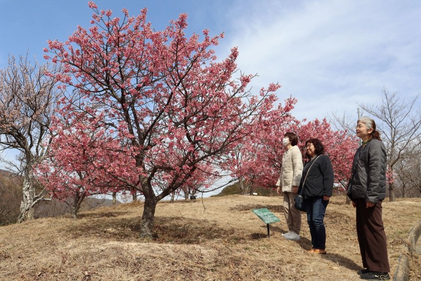 香川県小豆郡小豆島町池田の城山桜公園近くの遊歩道で、舘山寺桜(かんざんじざくら)が見頃を迎えている。濃いピンク色の花が青い空や海を背景に鮮やかに輝き、訪れた地元住民や観光客らの視線を引き付けている。花は3月中旬まで楽しめるという。