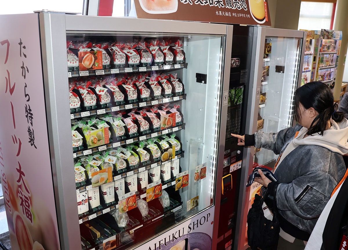 自動販売機は常温用と冷蔵用を国内線到着ロビー横に設置。いちご大福や季節のフルーツを包んだ大福、和三盆を使用したバウムクーヘンやプリンなど計19商品を取りそろえ、空港利用者らに地元の味を手軽に提供できるようにした。