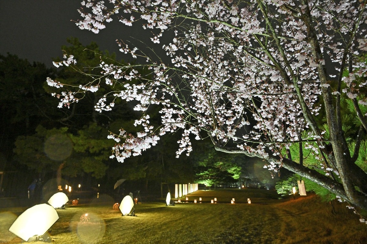 春のライトアップは今年で23回目。鑑賞コースに標本木周辺や芝生広場、日暮亭周辺といった見応えある定番スポットを設定するほか、今年は講武榭付近に桜の花びらをデザインした扇形のオブジェが初めてお目見え。そばには竹でできたかわいらしいまりが並び、こぼれ出す光と扇の美しさが特別な空間を演出している。