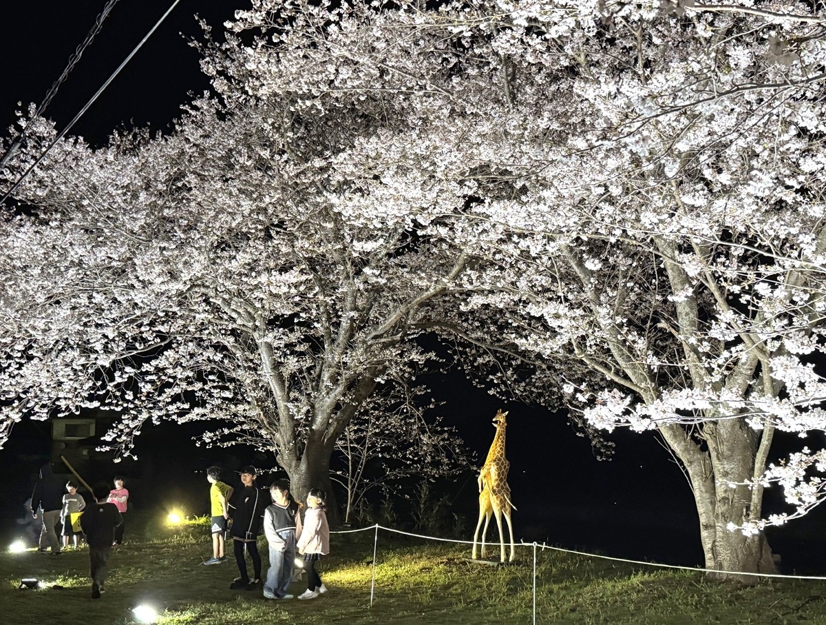 東かがわ市小海の松崎地区にある「小海の松崎桜」が見頃を迎え、地元有志によるライトアップが人気を集めている。家族連れらが訪れ、夜空に浮かぶ幻想的な桜景色を楽しんだり、昨年から展示しているキリンなどのオブジェの前で記念撮影をするなどして、春の訪れを感じている。