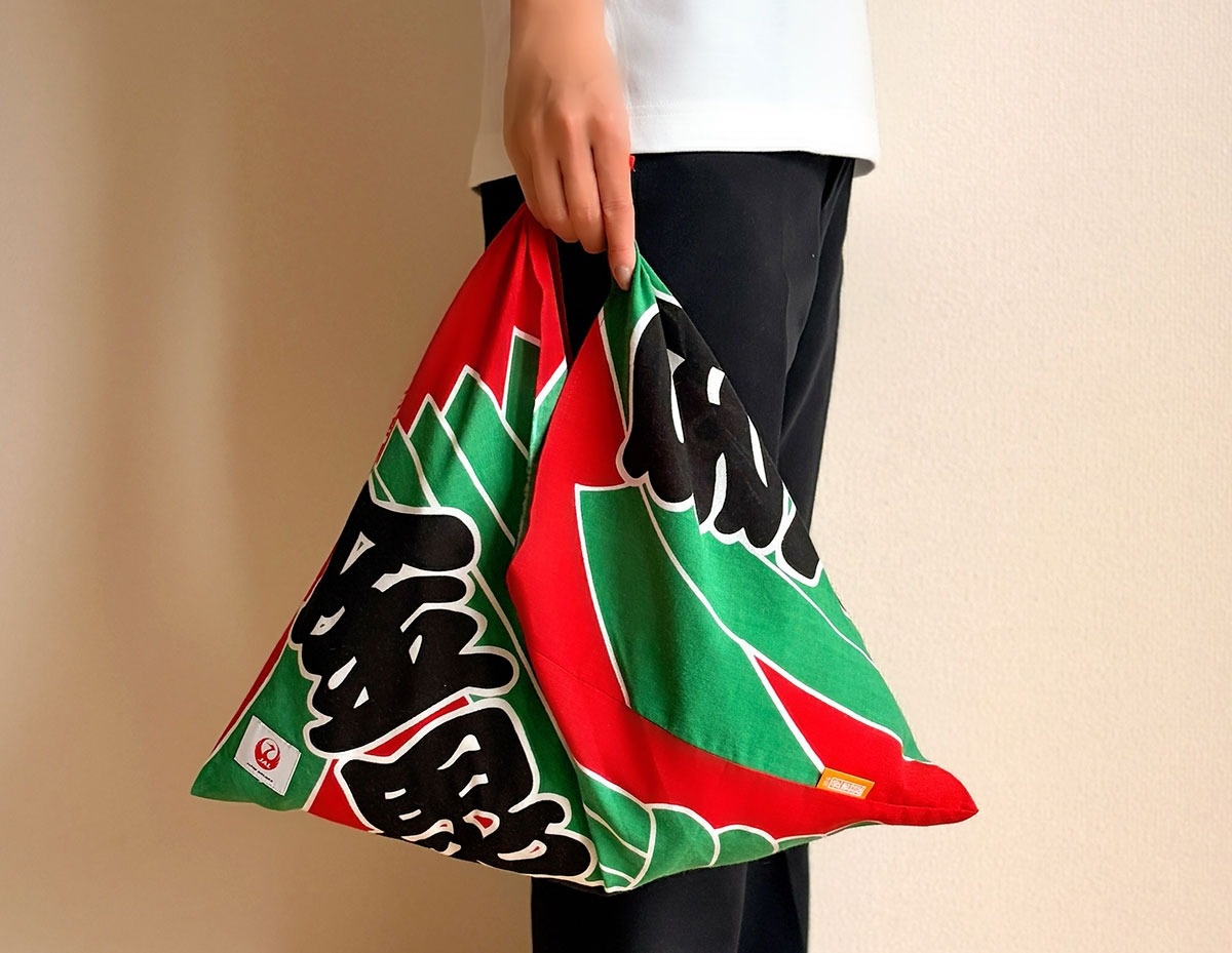 日航は公演中に町に飾られるのぼりをイメージしたあずま袋などを用意。6日から町内の一部旅館などで販売しているほか、公演期間中(10~26日)は会場の金丸座前の特設売店でも取り扱う。
