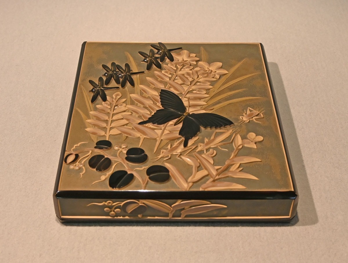 展示作のうち「彫漆色紙筥昆虫譜(ちょうしつしきしばここんちゅうふ)」(1938年)は、色漆の層を彫り下げて文様を浮き彫りにする彫漆の音丸耕堂(1898~1997年)初期の代表作。羽を広げたトンボやチョウを草花とともに箱のふたにあしらった。トンボの羽は彫漆の上に黒漆をさらに何層も重ねて立体感を表現。ツユクサには当時珍しかった紫の色漆と思われる跡があり、香川漆芸の色彩表現を押し広げた耕堂の先進性が見て取れる。