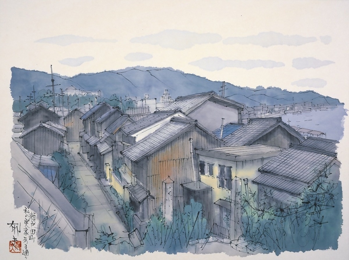 このうち第1章で取り上げる「瀬戸田町 私の実家のある通り」(99年、平山郁夫美術館蔵)は、素描シリーズ「しまなみ海道五十三次」の一つ。連なる民家のすぐ向こうには穏やかな海が広がり、幼少期の平山が日常的に見ていた瀬戸田町の風景を追体験できる。