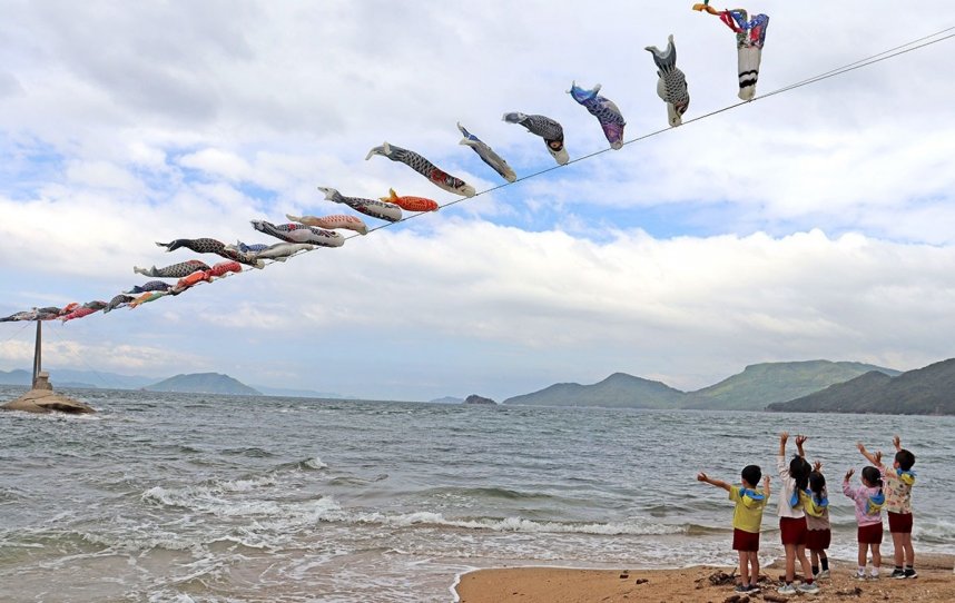 27日は、園外保育で同公民館を訪れていた小豆島こどもセンター(小豆島町蒲生)の年長、年中の園児37人がこいのぼりを見学。「大きくて元気いっぱい」「海の上は気持ち良さそう」などと話しながら、見上げていた。年長の平尾昂大ちゃん(5)は「海の上を泳ぐこいのぼりは迫力があって格好良い」とにっこり。井上陽彩ちゃん(5)は「こんなにいっぱい泳いでいるのは初めて見た。友達と一緒だと盛り上がる」と声を弾ませた。