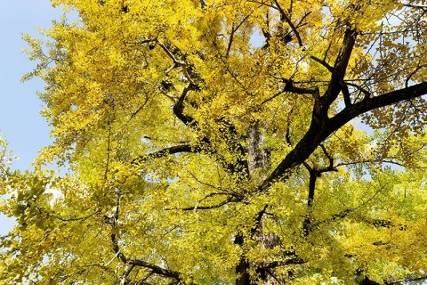 鳥居の脇に根を張る県指定天然記念物の大イチョウ。2本の大木から伸びた枝には無数の葉が茂り、日増し...