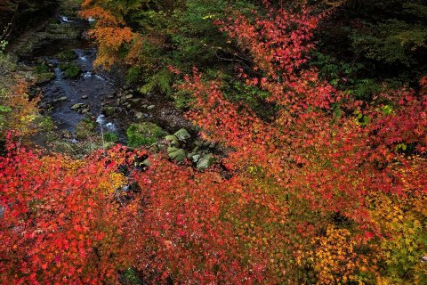 徳島との県境近くにある渓谷。国道438号を南下した三頭トンネル周辺は、寒さが進むにつれ秋色に染まり...