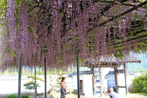 西讃を代表するフジの名所、香川県三豊市財田町の萬福寺(金山俊弘住職)で、フジ棚の「三尺藤」が満開...