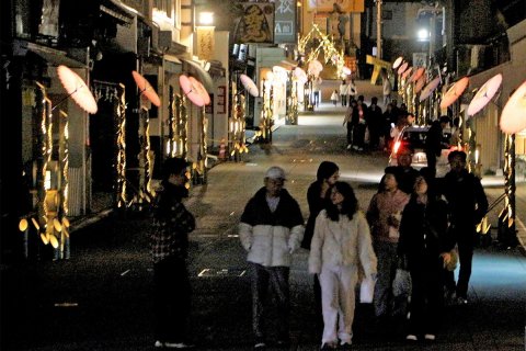 香川県仲多度郡琴平町の金刀比羅宮表参道に、まんのう町産の竹で作った竹明かり約50基が飾られている。...