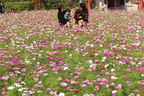 香川県小豆郡小豆島町田浦の二十四の瞳映画村で、遅まきのコスモス約5万本が見頃を迎えている。濃淡の...