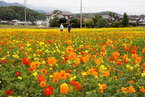 ヒマワリの名所として知られる香川県仲多度郡まんのう町帆山の畑で、キバナコスモスが見頃を迎えている...